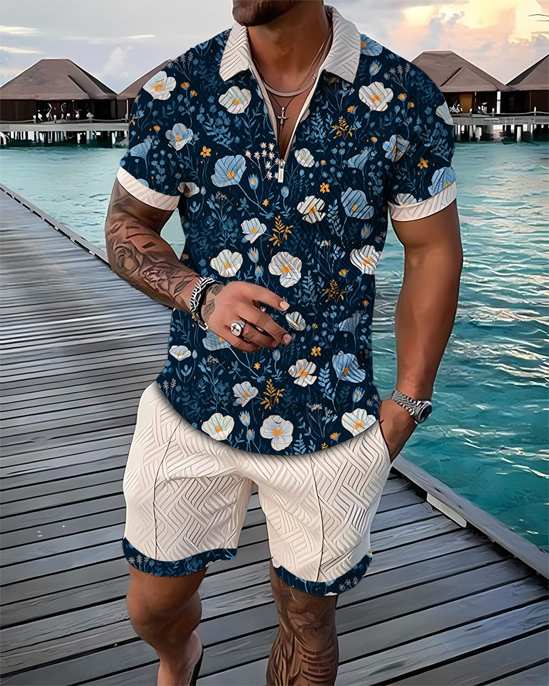Blue Blossom Polo Shirt And Shorts Co-Ord